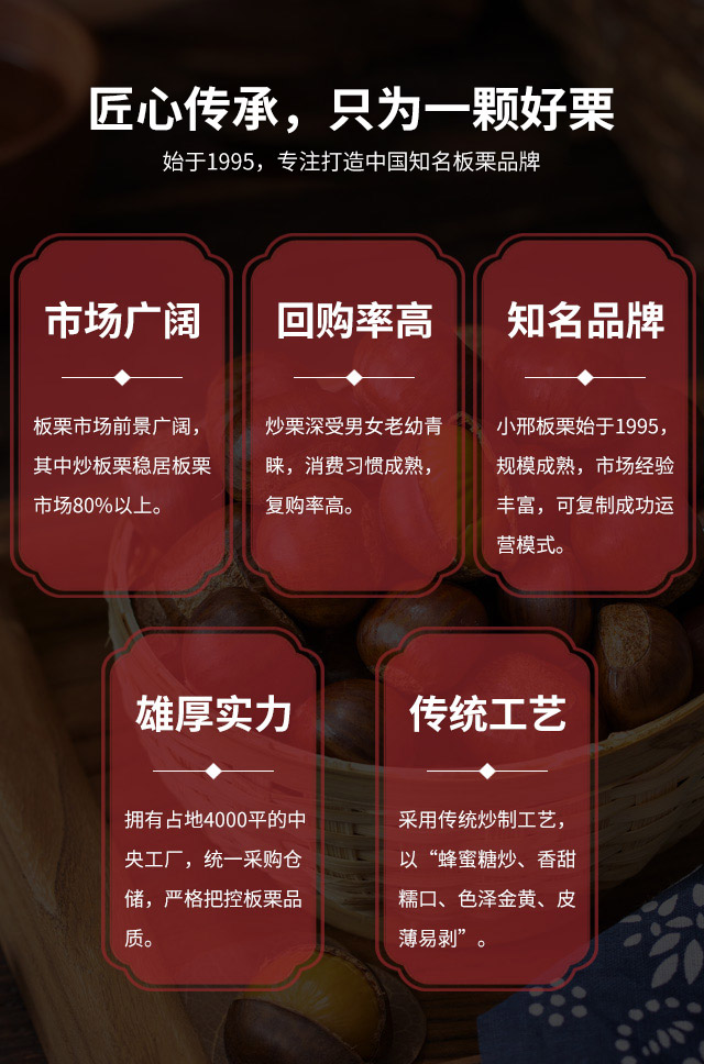 小邢板栗,始于1995年,以“蜂蜜糖炒、香甜软糯、色泽金黄、皮薄易剥”的产品特色,赢得广大食客的众多好评。 小邢板栗,精选产区品质栗源。迁西板栗,来自燕山南麓,长城脚下,素有“东方珍珠”的美誉。建瓯锥栗,来自武夷山脉,素有绿色金库之称。汇聚南北两大产...